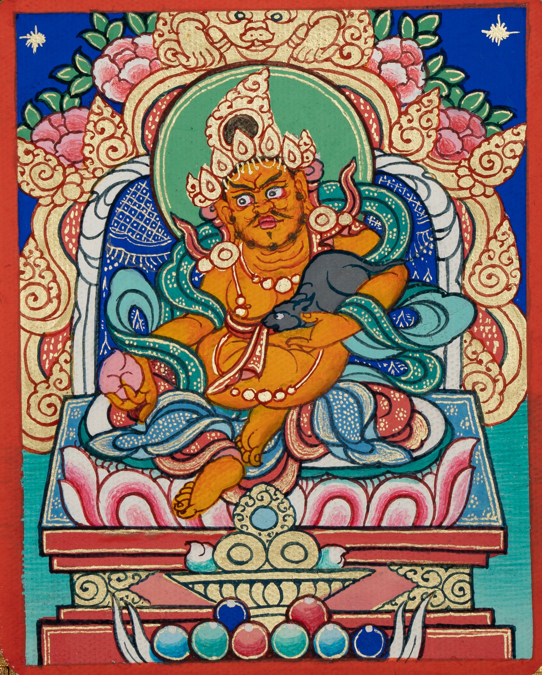 In the thangka, Yellow Dzambhala is depicted in his traditional iconographic form, seated on a moon disc upon a lotus, symbolizing purity and an enlightened mind. His body is painted in a warm golden-yellow hue, which radiates wealth, generosity, and spiritual prosperity. In his right hand, he holds a citron fruit, representing abundance and the fulfillment of both worldly and spiritual wishes. His left hand cradles a black mongoose named Nehulay, symbolizing Dzambhala's power to eliminate poverty and promote prosperity. The thangka also features a conch shell and a treasure vase, symbolizing the unending flow of wealth and blessings. This artwork serves as a powerful spiritual support for those seeking prosperity and inner transformation.